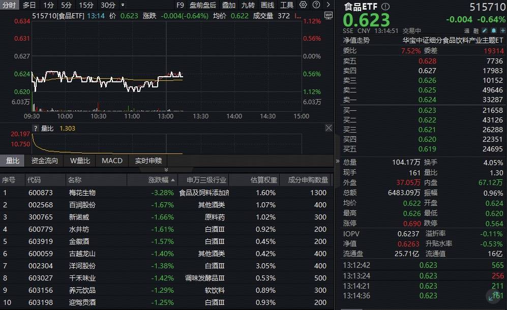 成份股方面、白酒及部分大众品跌幅居前。截至发稿,梅花生物大跌超3%,百润股份、水井坊、金徽酒、洋河股份等多股跌超1%,拖累板块走势。